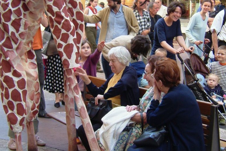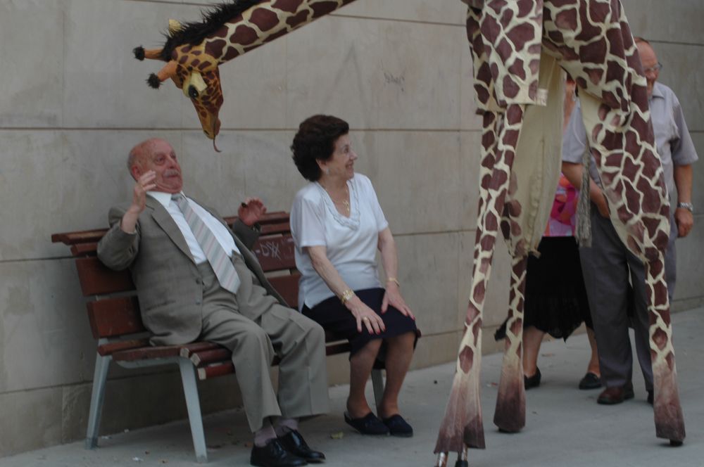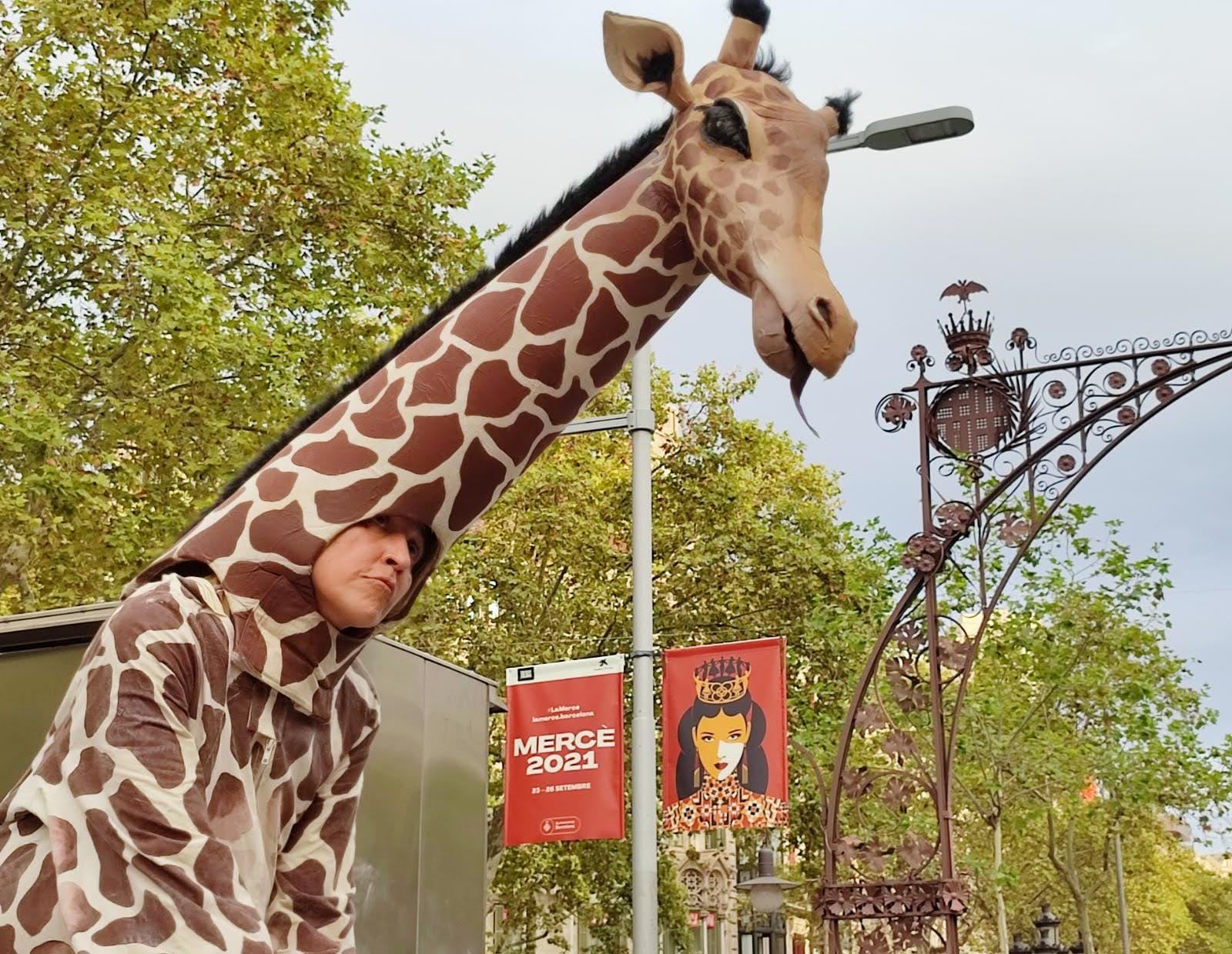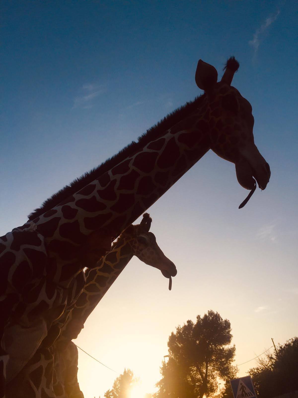 Una familia de Jirafas pasean elegantes y curiosas por las calles de la ciudad. Sorprendidas y desubicadas interactúan con todo lo que encuentran. Su ingenua curiosidad las lleva a crear situaciones surrealistas y poéticas. Espectáculo de calle itinerante. Una propuesta de altura y sin palabras para todos los públicos.