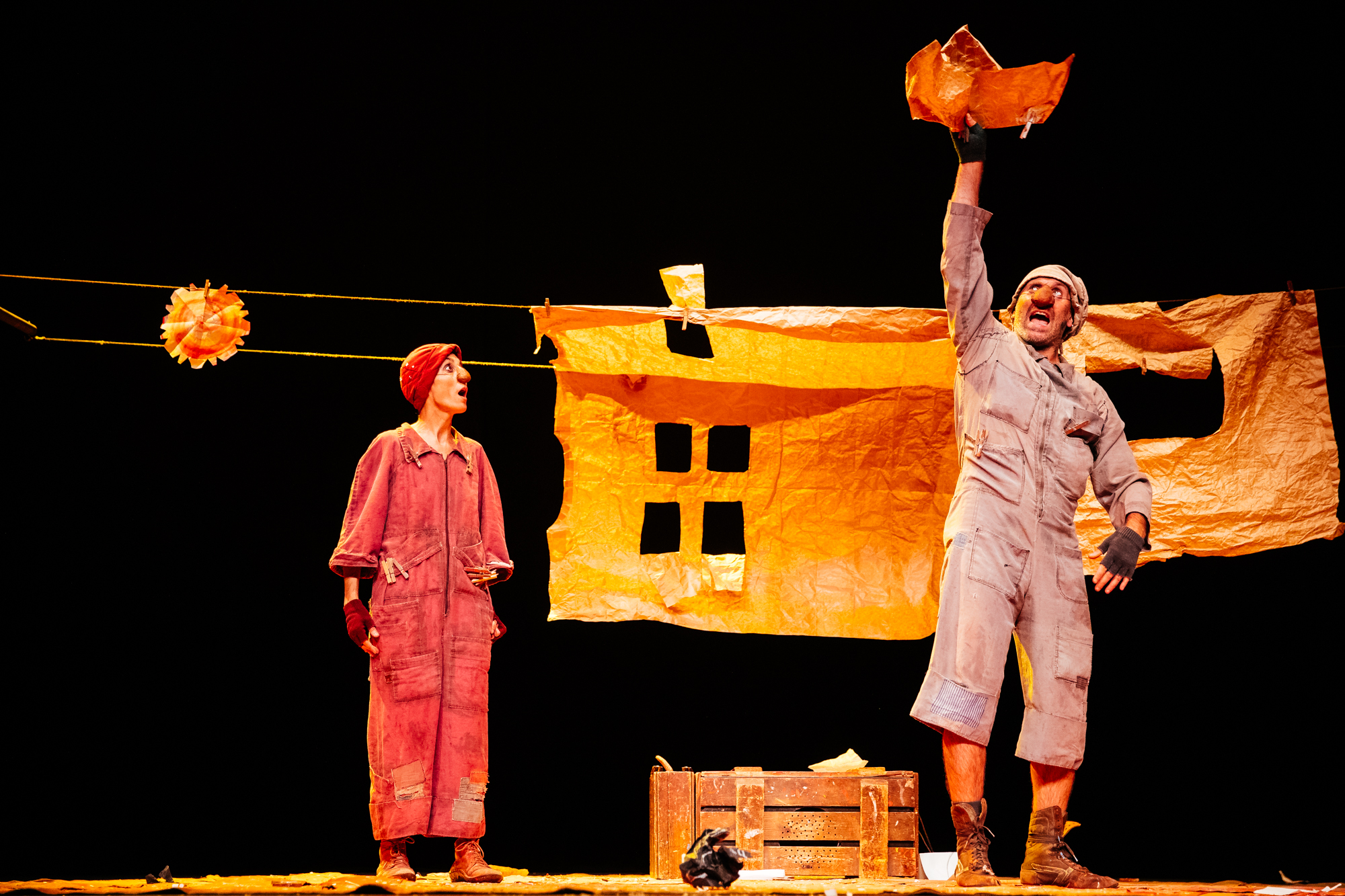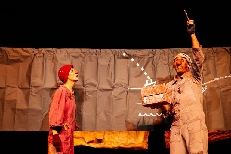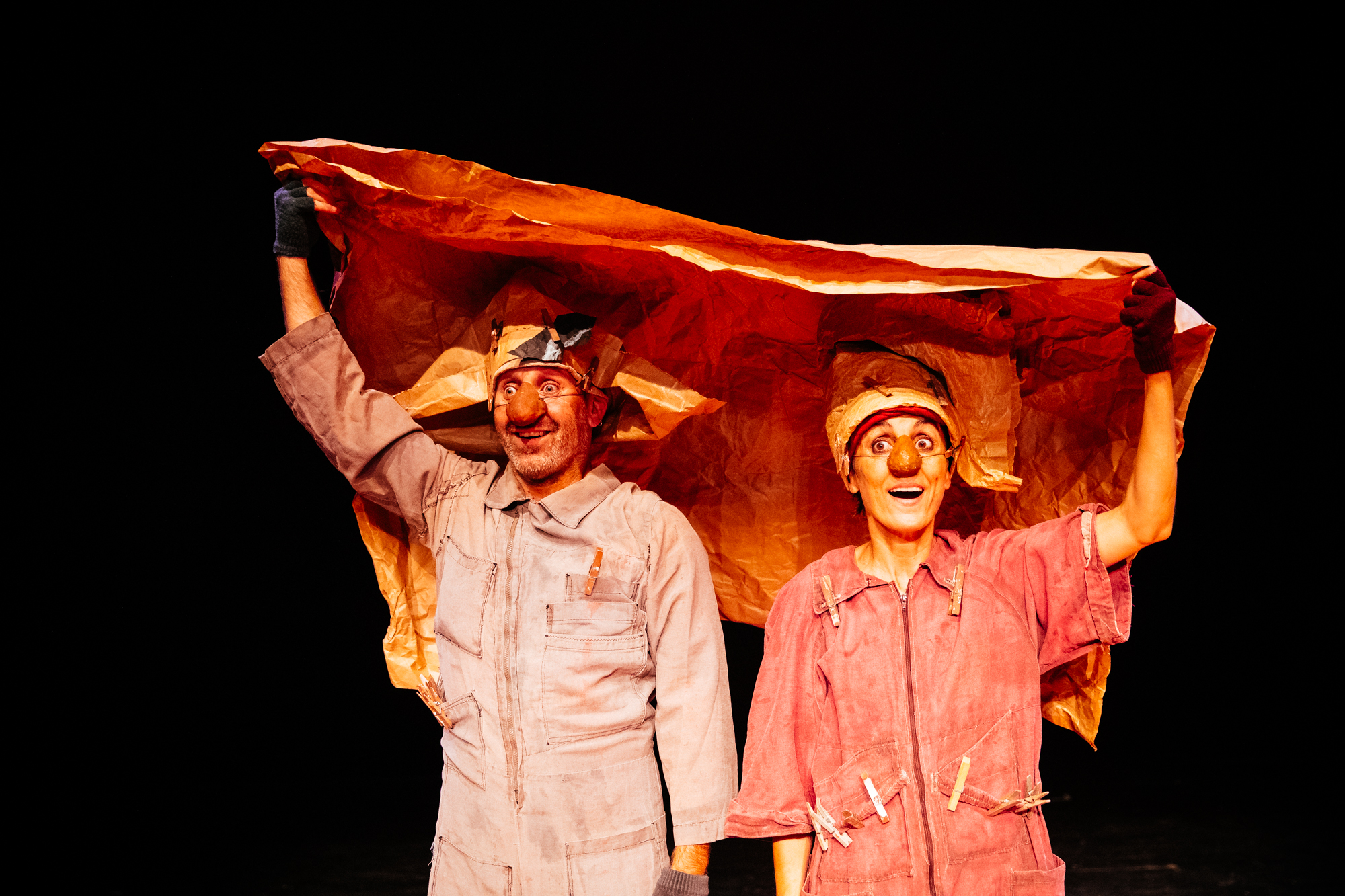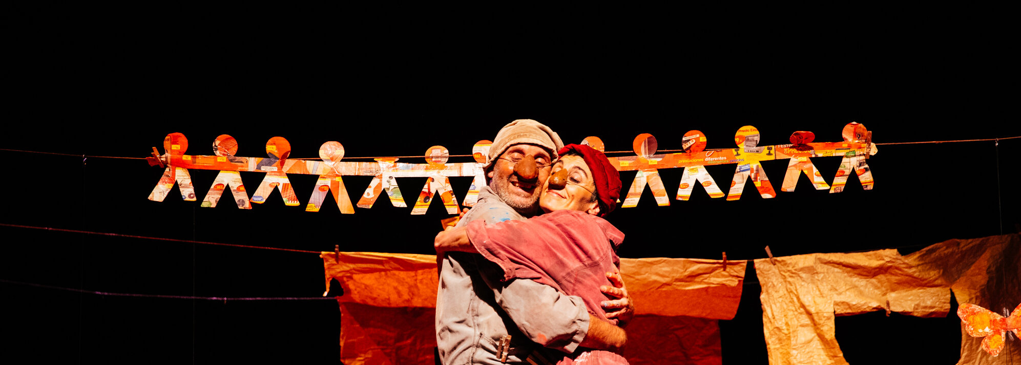 Un trabajador del muelle y una campesina se encuentran por casualidad escapando de la guerra. Juntos, con sentido del humor y sorprendente creatividad, darán vida a un nuevo mundo. Un espectáculo que habla de la amistad, de la guerra, de los temores que nos hacen pequeños, de los sentimientos y de la esperanza. Una escenografía en la cual el gesto, el humor y la creatividad son los protagonistas. … y así fue como de un trozo de papel ¡nació un nuevo mundo! Un espectáculo para aquellos que siguen soñando