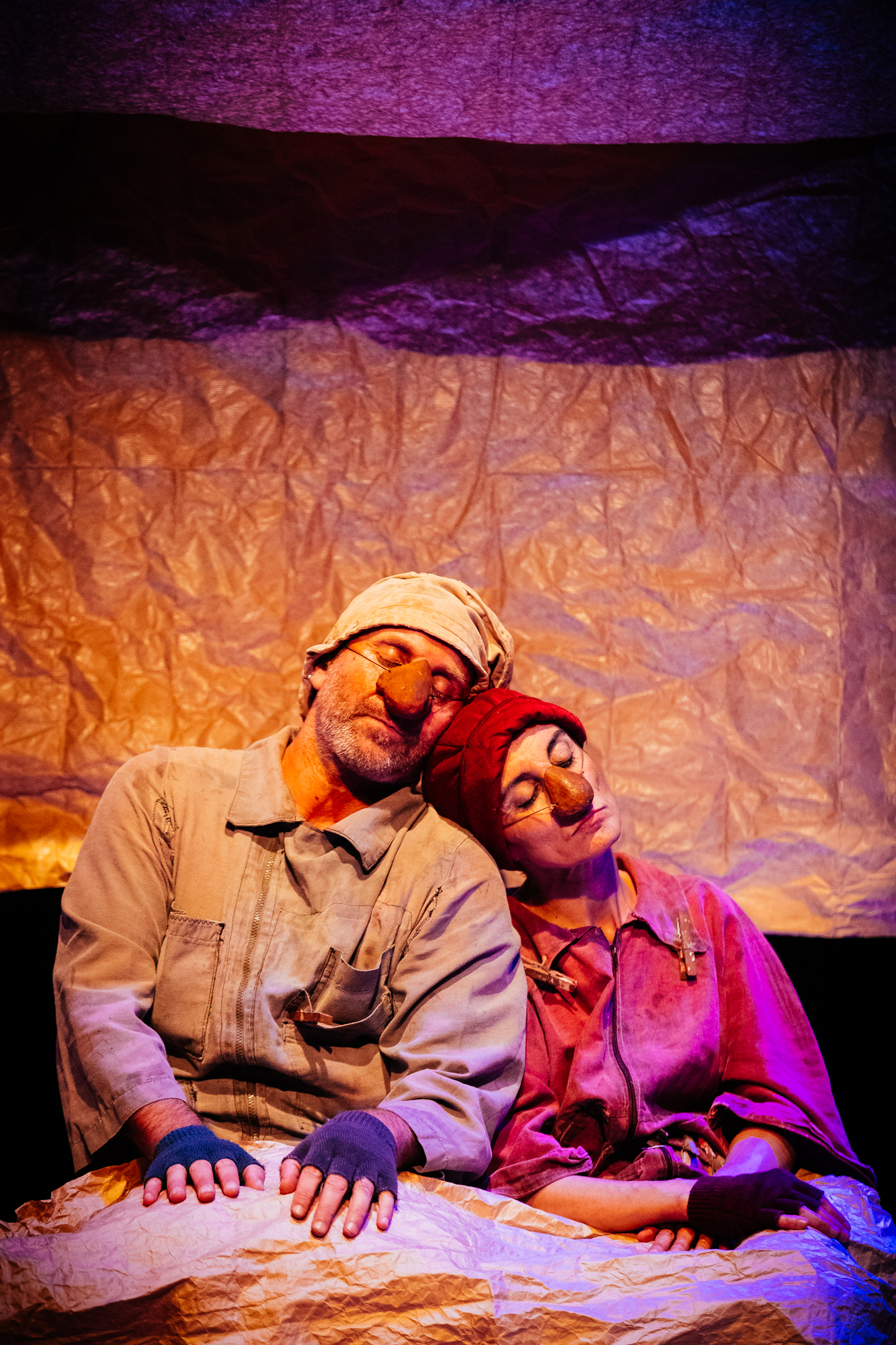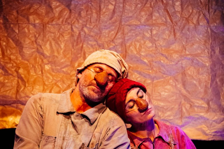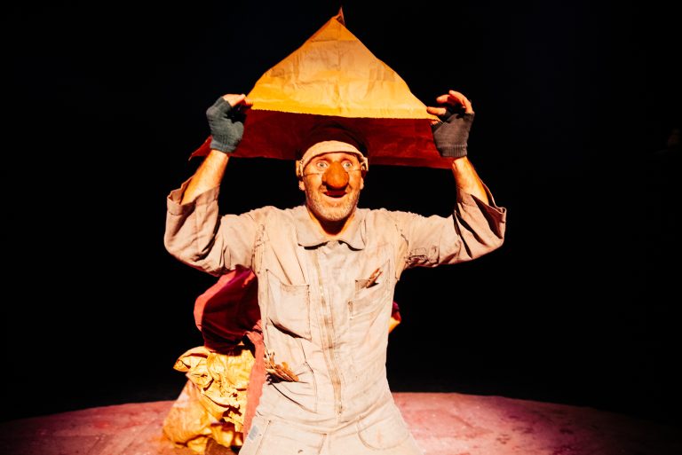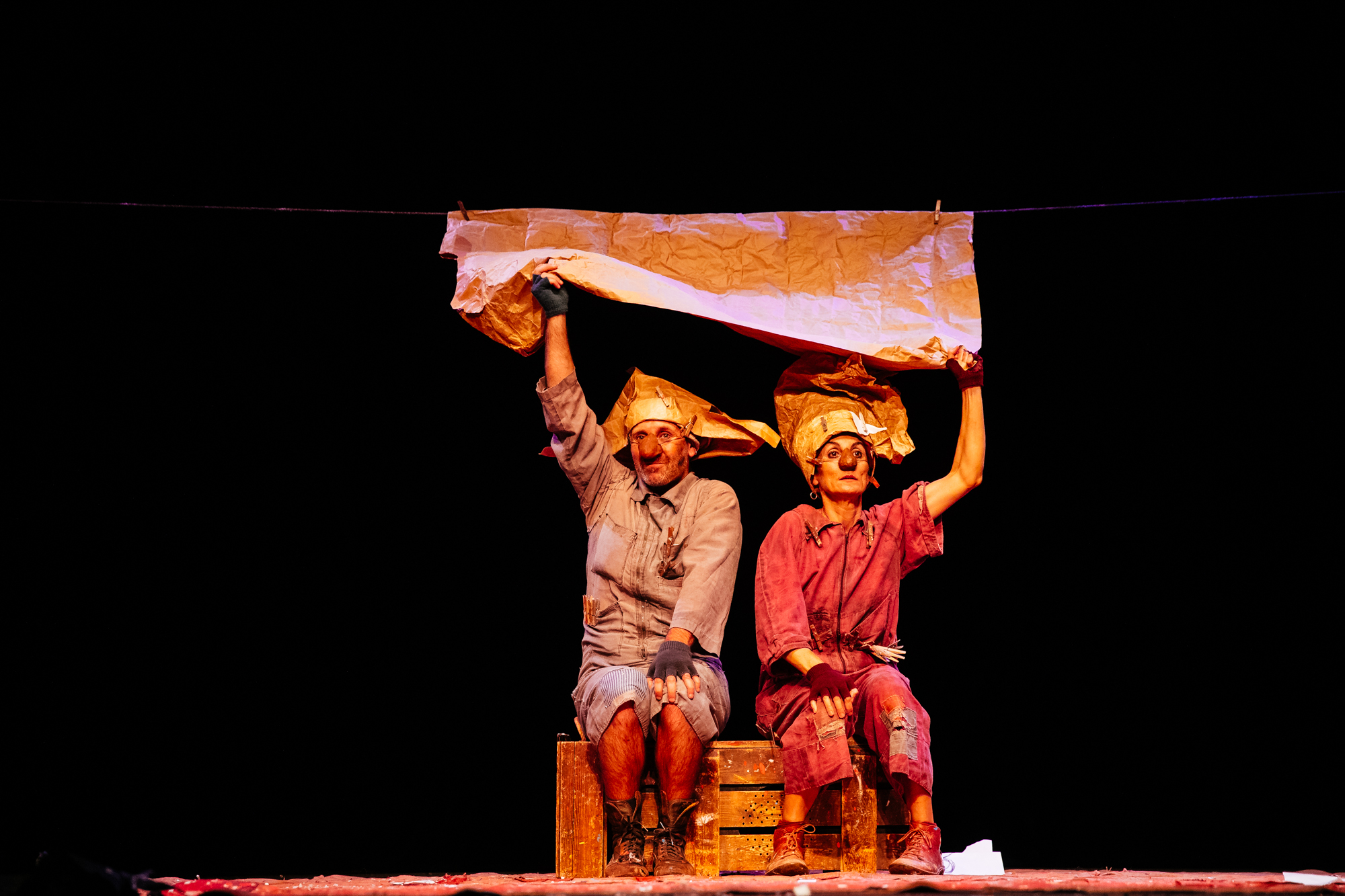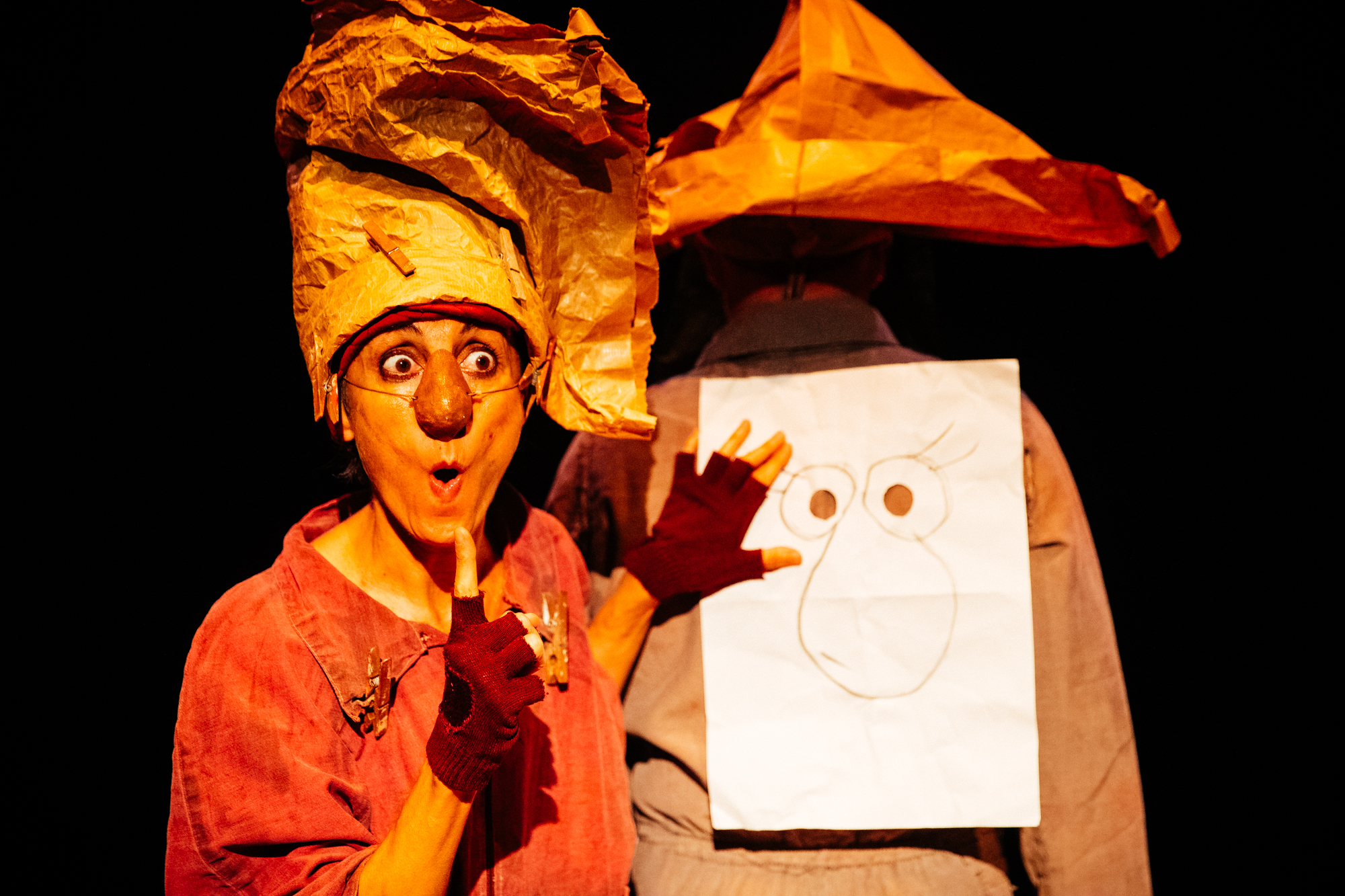 Un trabajador del muelle y una campesina se encuentran por casualidad escapando de la guerra. Juntos, con sentido del humor y sorprendente creatividad, darán vida a un nuevo mundo. Un espectáculo que habla de la amistad, de la guerra, de los temores que nos hacen pequeños, de los sentimientos y de la esperanza. Una escenografía en la cual el gesto, el humor y la creatividad son los protagonistas. … y así fue como de un trozo de papel ¡nació un nuevo mundo! Un espectáculo para aquellos que siguen soñando