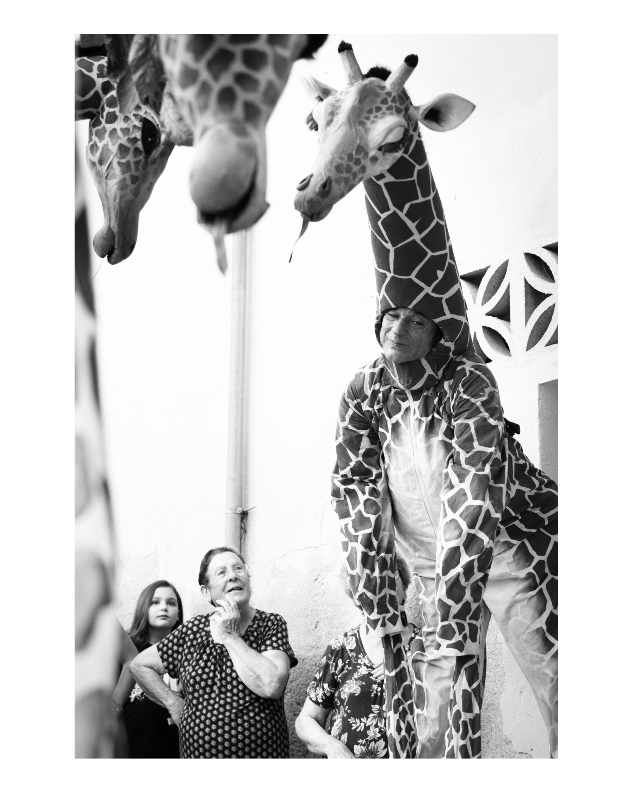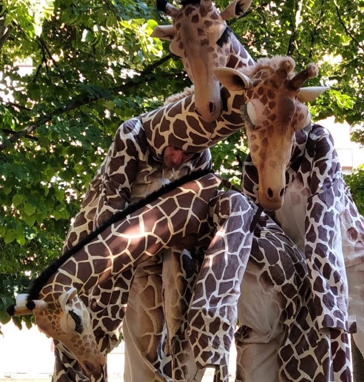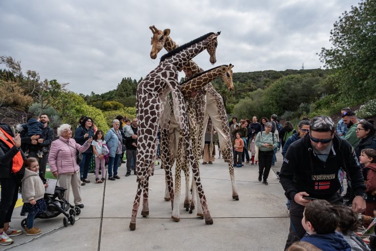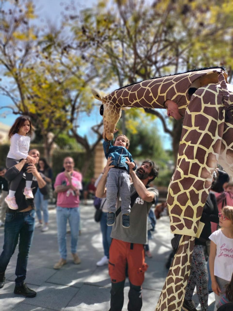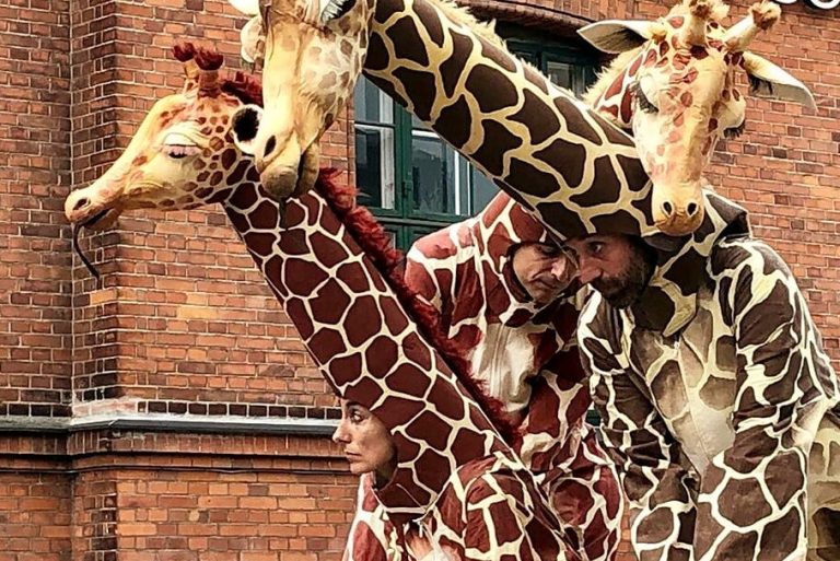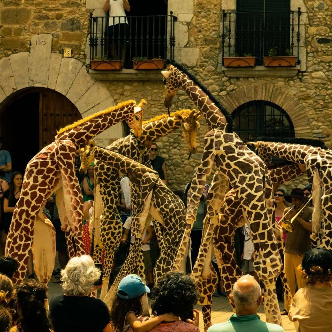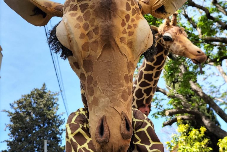 Une famille de girafes se promène au milieu de la civilisation. Surprises et désorientées, elles interagissent avec tout ce qu’elles trouvent. La curiosité les conduit à créer des situations surréalistes et poétiques à la fois. Spectacle de rue délicat et élégant. Spectacle en hauteur et muet pour tous les publics.