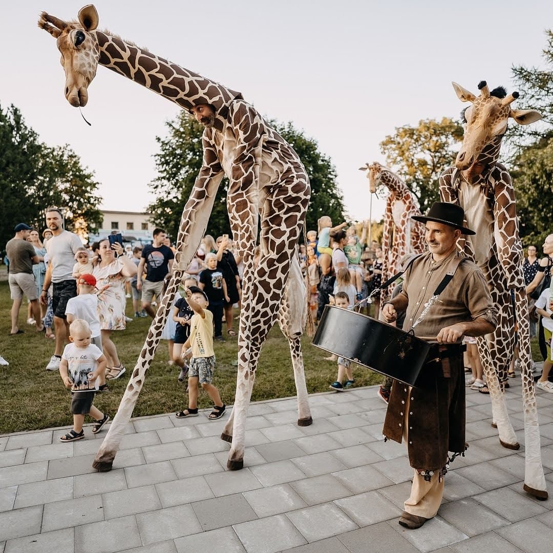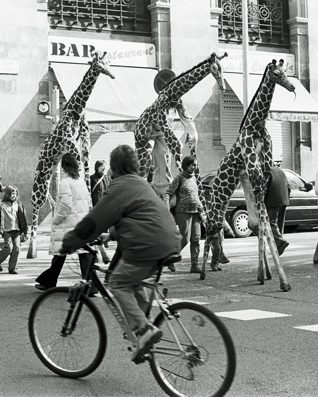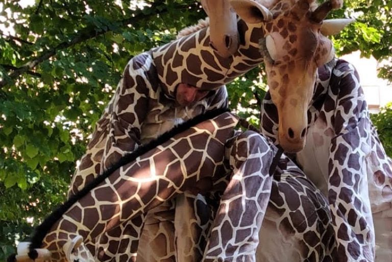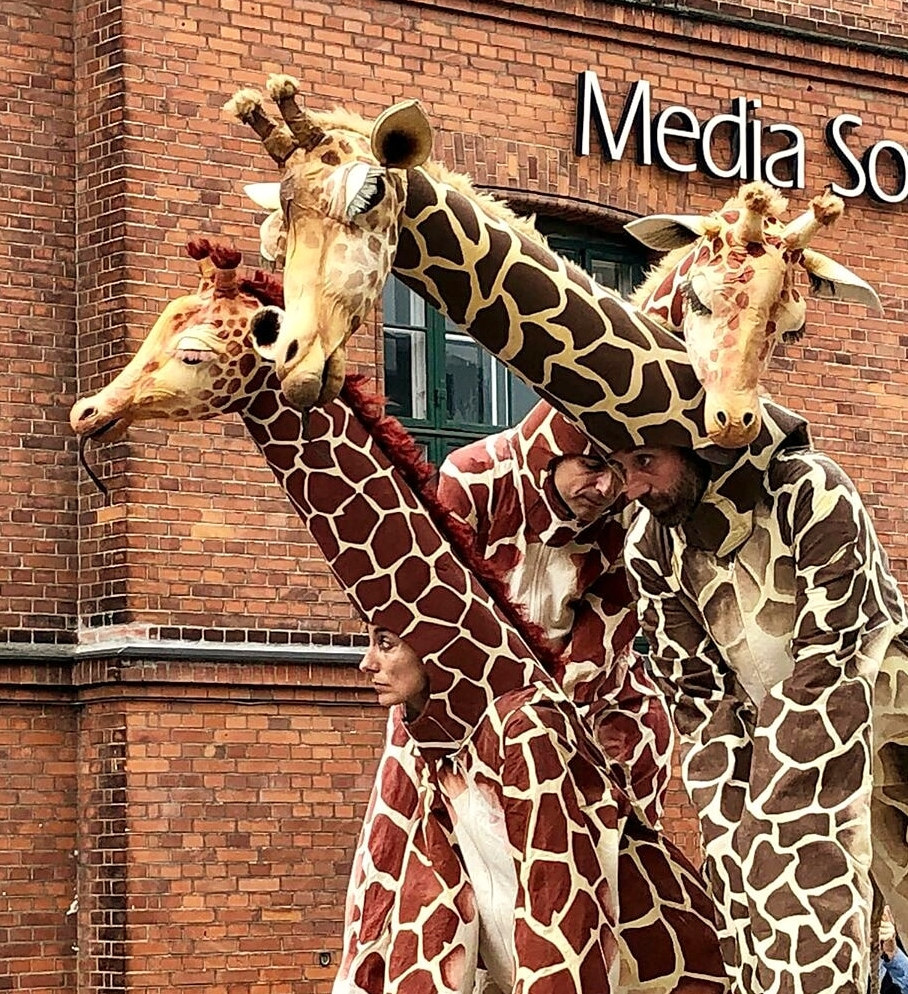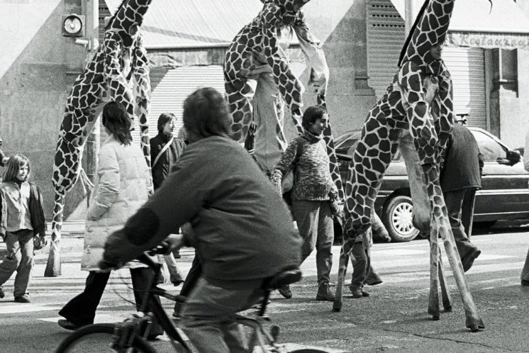 Une famille de girafes se promène au milieu de la civilisation. Surprises et désorientées, elles interagissent avec tout ce qu’elles trouvent. La curiosité les conduit à créer des situations surréalistes et poétiques à la fois. Spectacle de rue délicat et élégant. Spectacle en hauteur et muet pour tous les publics.